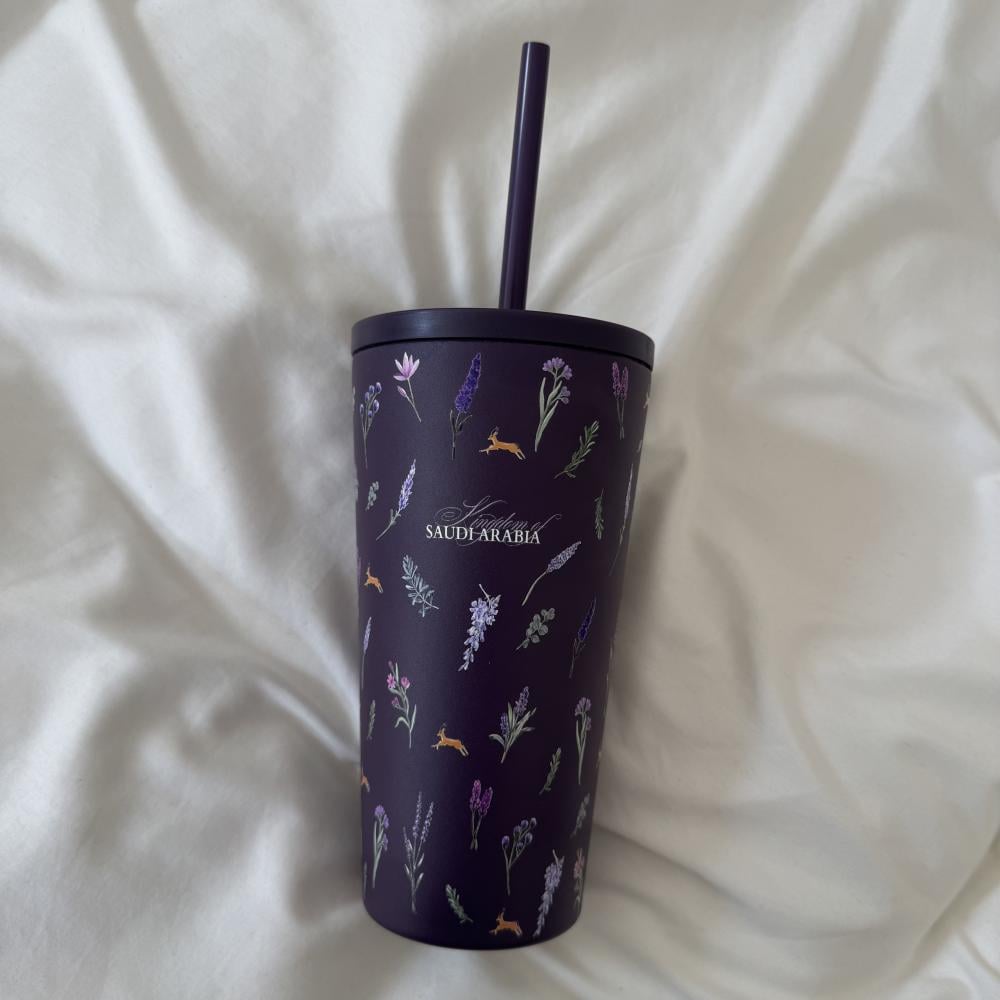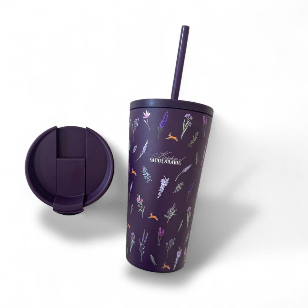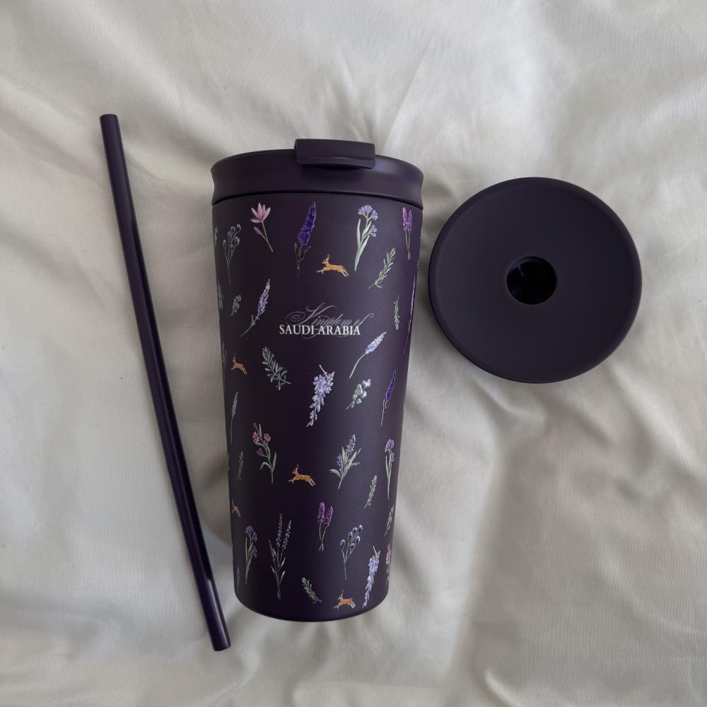 كوب يجمع بين الأناقة والهوية السعودية بتصميم خزامى وغزال مستوحى من الطبيعة.